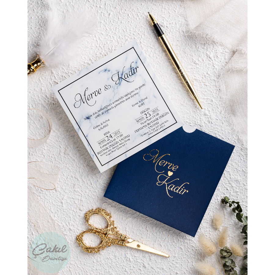 Altın yaldız ve varak, davetiyeye özel bir parıltı katar. Sektör tecrübemize dayanarak, varak uygulaması dikkatle yapılmazsa kağıdı deformeye uğratabilir.